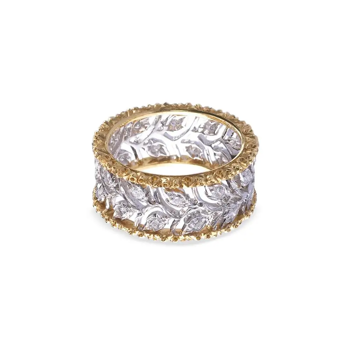 Anello eternelle in oro bianco traforato e diamanti, con bordi in oro giallo modellati a foglia.