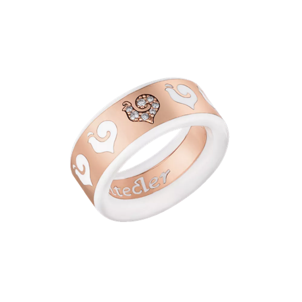 Anello fede Carousèl in oro rosa 18Kt, gallo in pavè di diamanti e smalto bianco