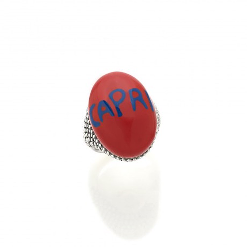 Anello in argento, cabochon rosso e scritta capri blu