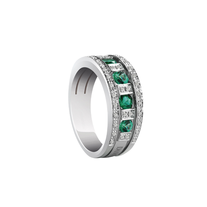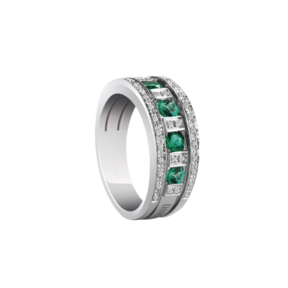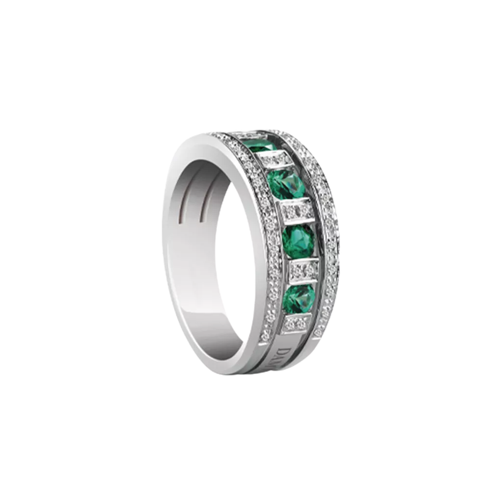 Damiani Anello collezione Belle Epoque in oro bianco 18 Kt con diamanti taglio brillante per una caratura totale di 0.21 Kt e smeraldi di caratura pari a 0.63Kt