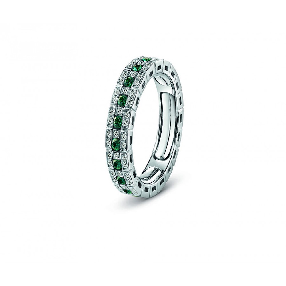 Damiani Anello collezione Belle Epoque Eternal Comfort in oro bianco e diamanti esmeraldi misura 14 adattabile a due misure in più attraverso un sistema di molle interno che ne garantisce comfort ed adattabilità