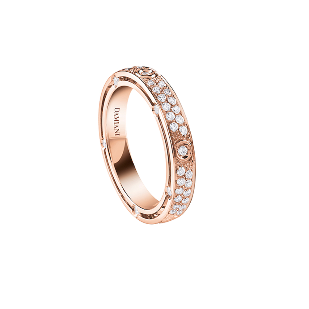 Damiani Anello collezione D-Side in oro rosa con pavè di brillanti. La collezione D-Side si arricchisce di modelli ancora più preziosi dove ai tradizionali diamanti laterali si aggiungono altri sopra la montatura per una caratura totale di 0.56 Kt, rendendo la collezione sempre più preziosa.