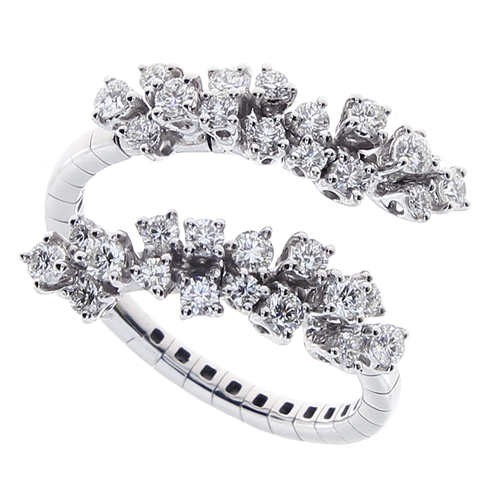 Damiani Anello collezione Mimosa in oro bianco con montatura a molla e diamanti taglio brillante. Questa montatura ha la capacità di adattarsi perfettamente a più misure