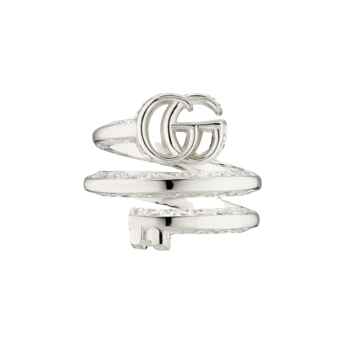Questo anello in argento sterling presenta l'inconfondibile Doppia G. Il logo caratterizza questo anello a doppia fascia. Sapientemente realizzata e dal design complesso, spesso con sottili richiami alla Maison, la collezione di gioielli in argento di Gucci presenta una selezione di pezzi contemporanei e classici.