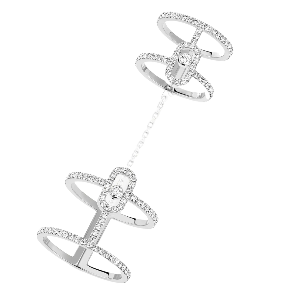 Non passerai inosservato con questo anello di lusso. Ispirato all'iconica creazione Glam'Azone e alle sue molteplici opzioni di indossabilità, il doppio anello con diamanti Move Uno presenta l'iconico motivo Move e il suo diamante mobile per una creazione 3 in 1. Questo gioiello in oro e diamanti ha una raffinata struttura traforata ed è pavimentato di diamanti. Cosa lo rende speciale? Due anelli in oro bianco uniti da una catena removibile che possono essere indossati insieme o separatamente, a piacere. La mano è valorizzata da questo nuovo e originale modo di indossare, dove i diamanti sembrano fluttuare sul dito.