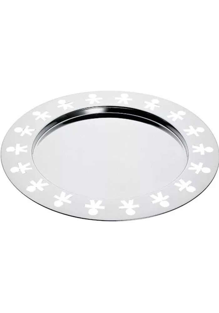 Vassoio girodonto in acciaio lucido con motivo ominii traforato.