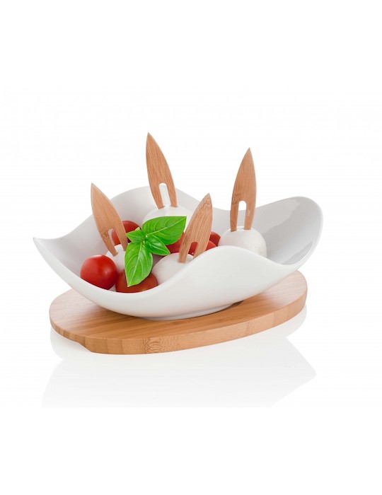 Un intreccio di alta qualità e contenuto estetico, tra la porcellana ed il bamboo. L’antipastiera nuvola bianca è pronta a consolidare un ruolo di primo piano nella tua tavola, grazie alle sue eleganti forme in porcellana ed alle 4 forchettine in bamboo incluse, particolari che hanno elevato il suo indice di gradimento tra le antipastiere BRANDANI gift group.