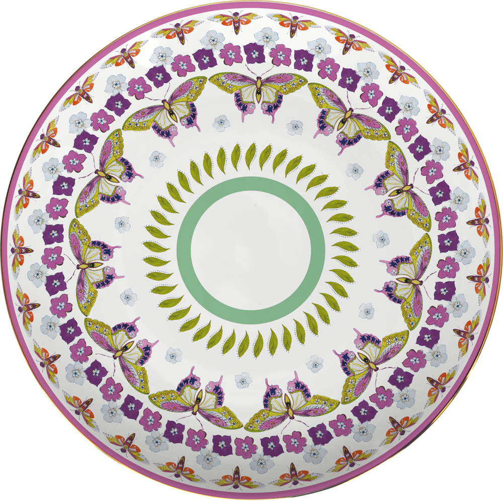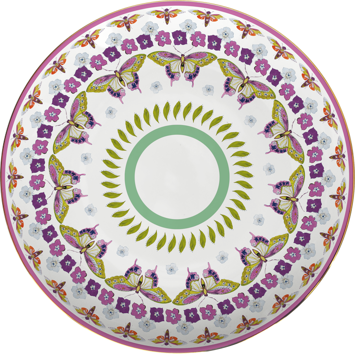Materiali e finiture preziose, fiori , foglie e farfalle dai colori vivaci si alternano e