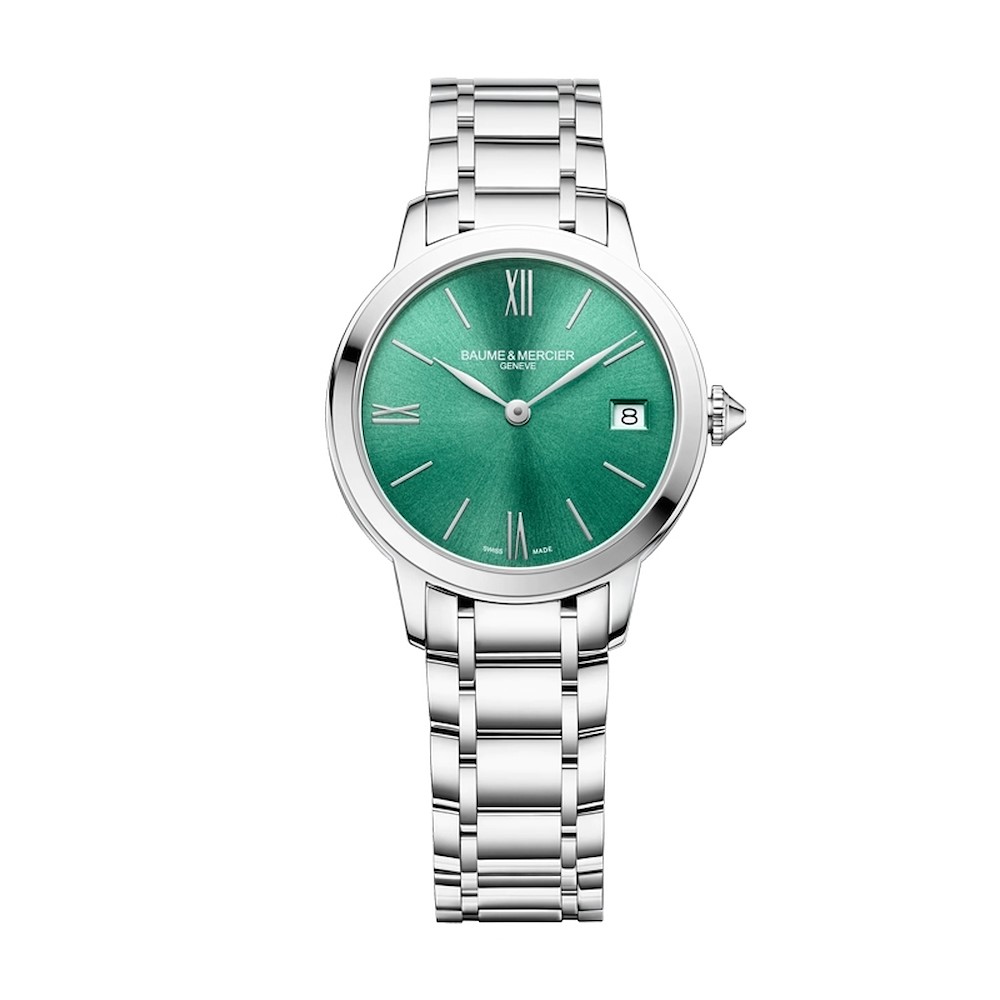 Illuminato da un quadrante verde chiaro con numeri romani, questo lussuoso orologio al quarzo da donna propone un’estetica pulita e moderna, equilibrata da dettagli classici. È accompagnato da un bracciale in acciaio, ideale per ogni occasione.
