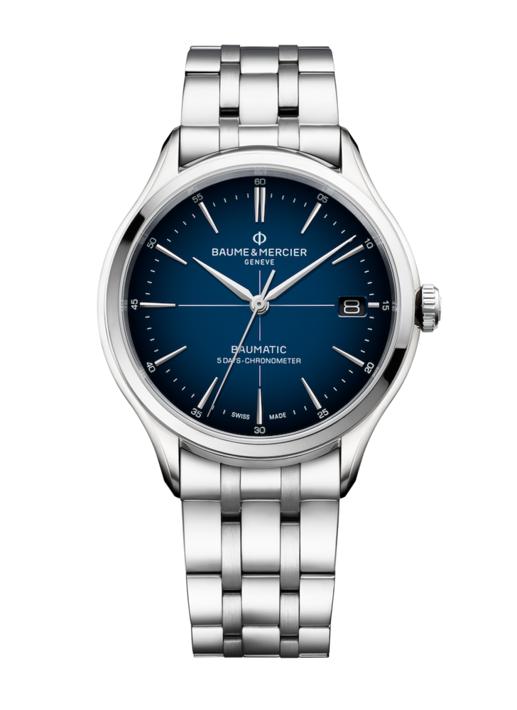 Il Clifton Baumatic 10468 sfoggia un design cool urbano, perfetto per il professionista ambizioso. Completano questo cronometro da uomo il quadrante blu sfumato, di grande impatto grafico, e il bracciale in acciaio inossidabile con finitura satinata, in tono con la cassa in acciaio.