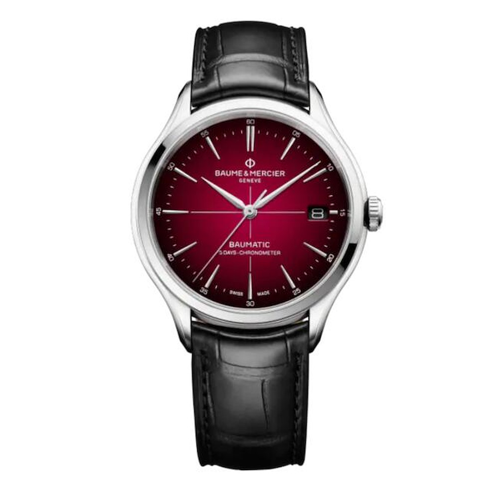 Questo pregevole cronometro Clifton Baumatic con certificazione del COSC unisce la straordinaria estetica di una cassa in acciaio lucido alla profondità del quadrante bordeaux sfumato. Il cinturino intercambiabile in pelle nera offre un’ampia versatilità nello stile.