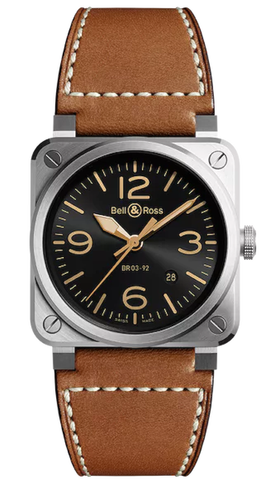 Bell & Ross BR-CAL.302 orologio meccanico automatico con quadrante Motivo soleil nero. Numeri e indici applicati placcati oro. Lancette delle ore e dei minuti in metallo scheletrate riempite di Super-LumiNova®. Vetro in zaffiro trattato antiriflesso, impermeabilità 100 metri con cinturino in vitello conciato al vegetale color oro e tela sintetica ultraresistente nera.