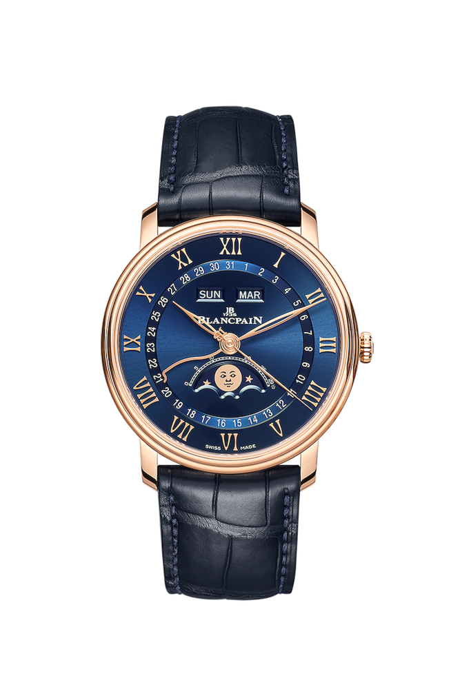 Caratterizzato dal calendario completo, questa complicazione indica data, giorno della settimana e mese. Il volto mutevole della Luna, riprodotto sul quadrante, aggiunge una nota poetica all’insieme. La riproduzione dei cicli lunari sul quadrante delle creazioni Blancpain richiama legami ancestrali tra l’orologeria e l’astronomia. Questi orologi indicano se la Luna è nuova, crescente, piena o calante.