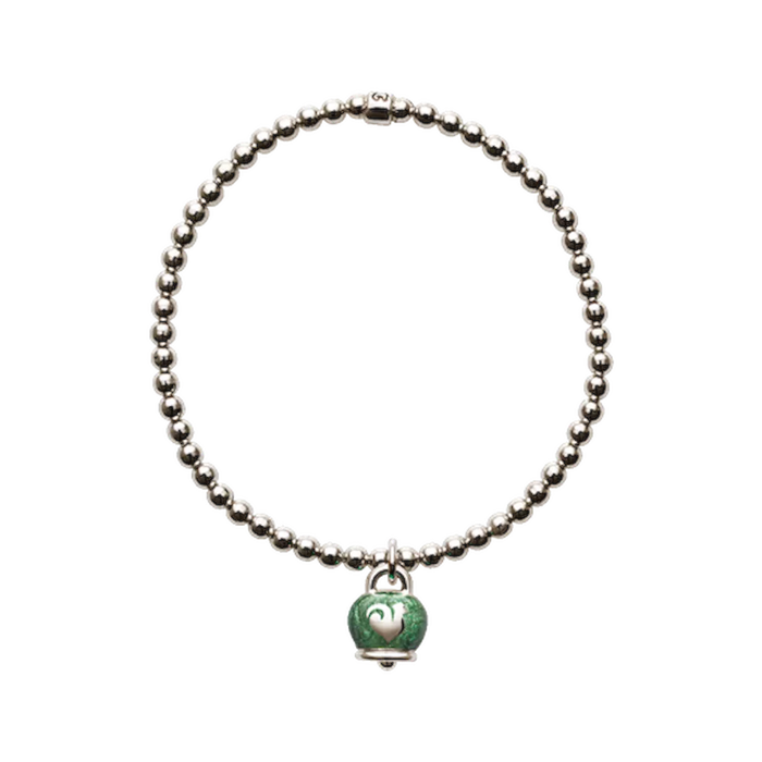 Bracciale elastico in argento con ciondolo campanella micro in argento e smalto verde, biglierina fissa.