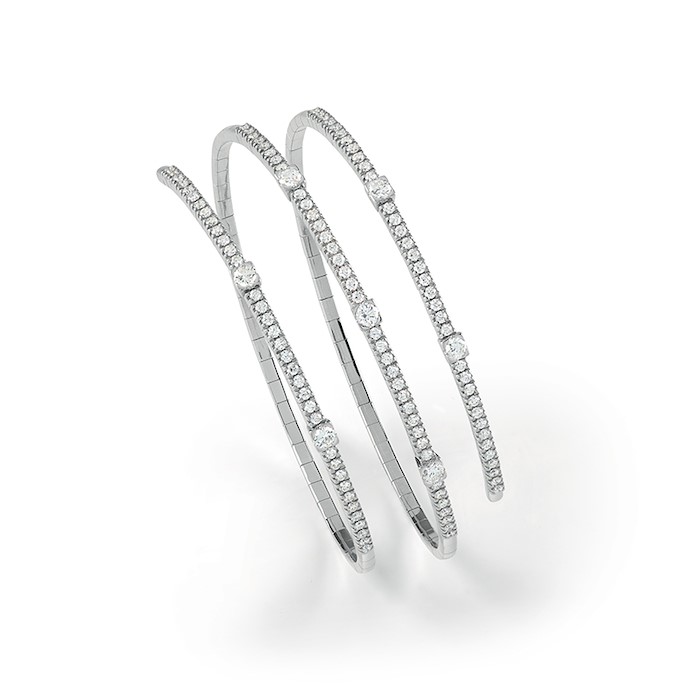 Damiani Bracciale in oro bianco collezione Notte San Lorenzo con diamanti taglio brillante incastonati in una montatura a molla che abbraccia perfettamente il polso, rendendolo leggero ed indossabile nella quotidianità