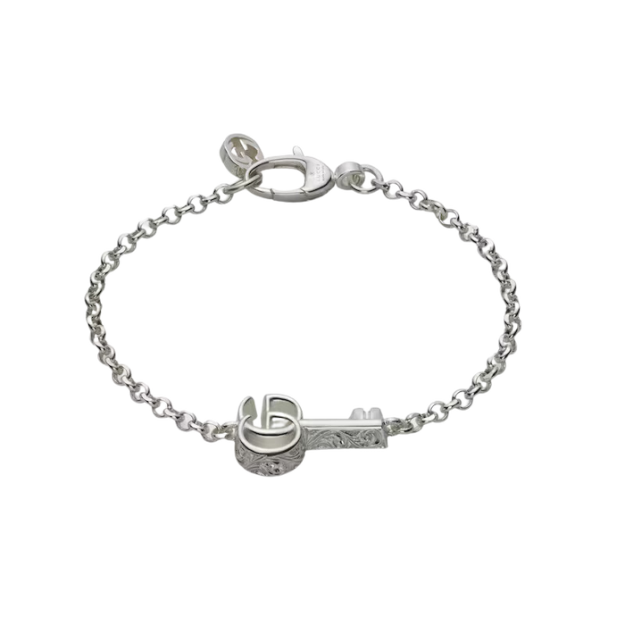 Questo bracciale in argento sterling presenta una chiave con la caratteristica Doppia G come parte superiore. Realizzata con estrema cura e con un design ricercato, con sottili richiami alla Maison, la collezione di gioielli in argento Gucci è presentata in una serie di modelli dal flair contemporaneo e classico.