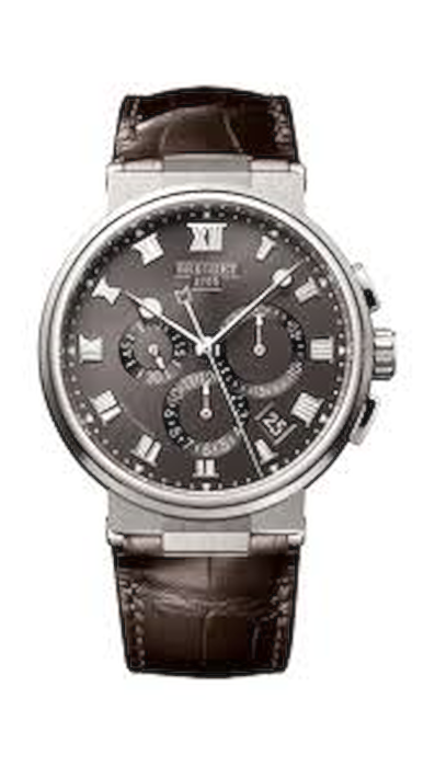 Marine Chronographe. Movimento a carica automatica con datario e piccoli secondi. Contatori dei minuti e delle ore. Spirale in silicio. Fondello in vetro zaffiro. Corona a vite. Impermeabile fino a 10 bar (100 metri).