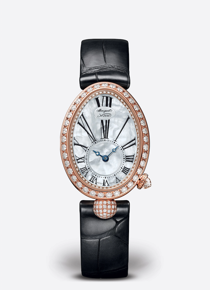 Cassa in oro bianco 18 carati di forma ovoidale, curvata, con carrure finemente scanalata. Lunetta, réhaut e attacchi incastonati di 139 diamanti taglio brillante (circa 1,255 carati). Corona incastonata di un diamante briolette (circa 0,26 carati). Fondocassa in vetro zaffiro. Dimensioni 33 x 24,95 mm. Impermeabile fino a 3 bar (30 m).