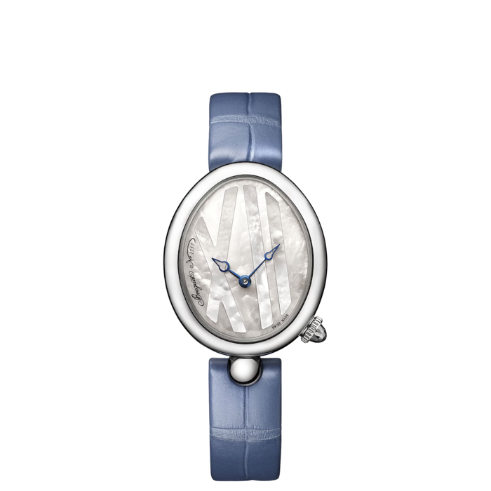 Cassa in acciaio di forma ovoidale curvata, a telaio finemente scanalato. Fondocassa di zaffiro. Dimensioni 32,7 x 27,3 mm. Impermeabile fino a 3 bar (30 m). Quadrante in madreperla naturale bianca cangiante. Giro delle ore decentrato a ore 6. Indici con numeri romani realizzati con intarsi in madreperla naturale bianca. Movimento meccanico a carica automatica. Cal. 586/1. Riserva di marcia di 38 ore. Scappamento ad àncora svizzera in linea. Bilanciere Breguet. Spirale in silicio. Frequenza 3 Hz.