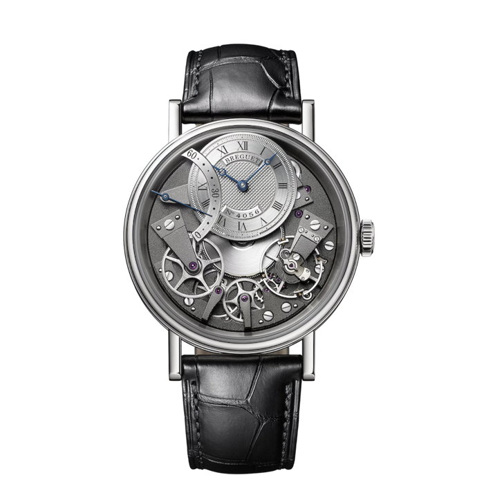Orologio Tradition in oro 18 carati. Movimento antracite a carica automatica con secondi retrogradi. Spirale Breguet in silicio. Quadrante decentrato in oro argentato, con lavorazione guilloché realizzata a mano. Fondello in vetro zaffiro. Impermeabile fino a 3 bar (30 m).