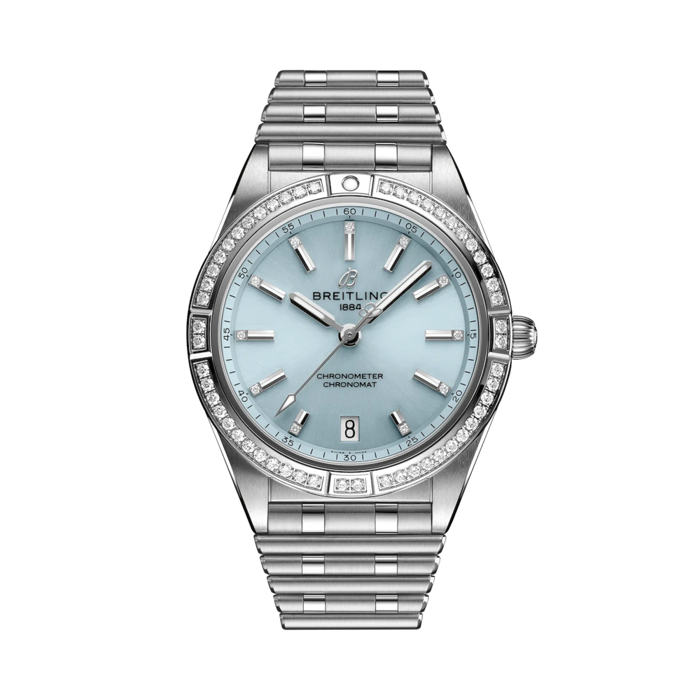 Alla moda e al tempo stesso elegante, il Chronomat Automatic 36, di ispirazione moderna-retrò, è l’orologio sportivo e chic versatile per ogni occasione. È disponibile in una gamma di casse in metallo, dal freddo acciaio inossidabile, al bicolore che «va su tutto», o anche in lussuoso oro rosso 18 carati. Le donne che ricercano una maggiore brillantezza potranno anche optare per lunette con diamanti incastonati, indici e quadranti colorati. Questo Chronomat Automatic 36 specifico monta una cassa in acciaio inossidabile con una lunetta in oro grigio da 18 carati e pietre preziose incastonate abbinata a un quadrante blu ghiaccio. Questo Chronomat è animato dal Calibro Breitling 10, cronometro certificato COSC.