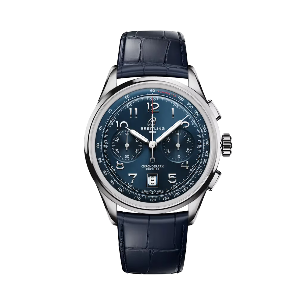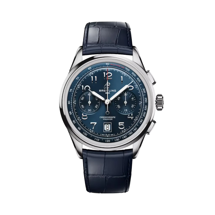 All’inizio degli anni ’40, Willy Breitling stava già sognando un periodo post-conflitto, dove l’utilità avrebbe lasciato spazio a un ottimismo senza freni. Iniziò a disegnare un cronografo funzionale, ma al contempo innegabilmente elegante, da poter indossare all’infinito e che fosse, per usare le sue stesse parole, «il segno inequivocabile di un gusto impeccabile». E chiamò questa nuova linea Premier. Per creare il Premier moderno, Breitling ha preservato i dettagli distintivi della versione vintage, compresa la lunetta liscia fissa, il quadrante con doppio registro, i pulsanti rettangolari affusolati e i numeri arabi applicati. Il Premier B01 Chronograph 42 si propone in una gamma di colori del quadrante e di materiali della cassa. È disponibile con una varietà di classici cinturini in pelle di coccodrillo o con un elegante bracciale in metallo a sette file. Il Premier moderno è anche all’altezza dei rigidi standard tecnici di Willy Breitling, con il suo eccezionale movimento a carica automatica – il calibro di manifattura Breitling 01 certificato COSC – progettato per la massima precisione, affidabilità e funzionalità.