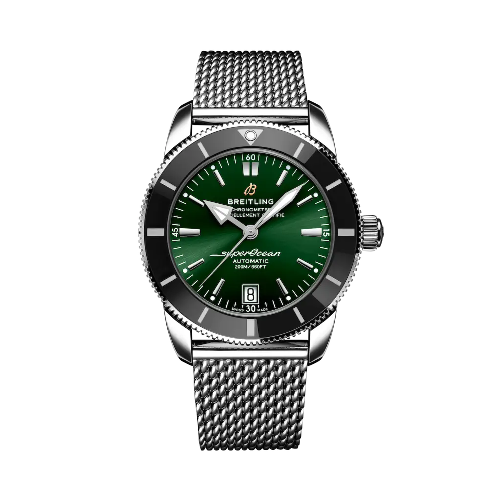 Ispirato al Superocean originale degli anni ’50, il Superocean Heritage combina un design dalle caratteristiche iconiche con un tocco di modernità. Sportivo ed elegante, il Superocean Heritage è la vera incarnazione dello stile acquatico. Caratterizzato dalle iconiche lancette di forma triangolare e da una lunetta unidirezionale con anello in ceramica lucida, il Superocean Heritage è un orologio subacqueo dall’aspetto elegante. Disponibile in diverse misure e materiali tra cui l’acciaio inossidabile e l’oro rosso 18 carati, il Superocean Heritage B20 Automatic presenta una gamma di quadranti in nero, blu o verde. Proposto con un bracciale a maglie abbinato o con cinturino in caucciù «lavorato a maglie» adattabile a una fibbia deployante, questo Superocean Heritage è azionato dal Calibro di manifattura Breitling B20, un cronometro certificato COSC ispirato al Calibro Tudor MT 5612.