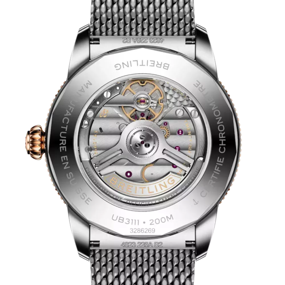Questo orologio è equipaggiato con il calibro di manifattura Breitling B31, un movimento meccanico a carica automatica che assicura una riserva di carica di circa 78 ore e una frequenza di 28.800 alternanze/ora, per prestazioni affidabili e durature. Il datario è visibile attraverso una finestrella sul quadrante. La cassa, realizzata in una combinazione di acciaio inossidabile e oro rosso 18 carati, unisce robustezza ed eleganza, ed è impermeabile fino a 200 metri. Il vetro zaffiro bombato con trattamento antiriflesso su entrambi i lati garantisce una perfetta leggibilità in ogni condizione di luce. Con un diametro di 42 mm, una larghezza ansa di 22.05 mm e un peso complessivo di circa 153.3 g (72.7 g per la sola testa), l’orologio è abbinato a un bracciale in acciaio inossidabile dal design dritto, con attacco da 22 mm, per uno stile raffinato e sportivo allo stesso tempo.