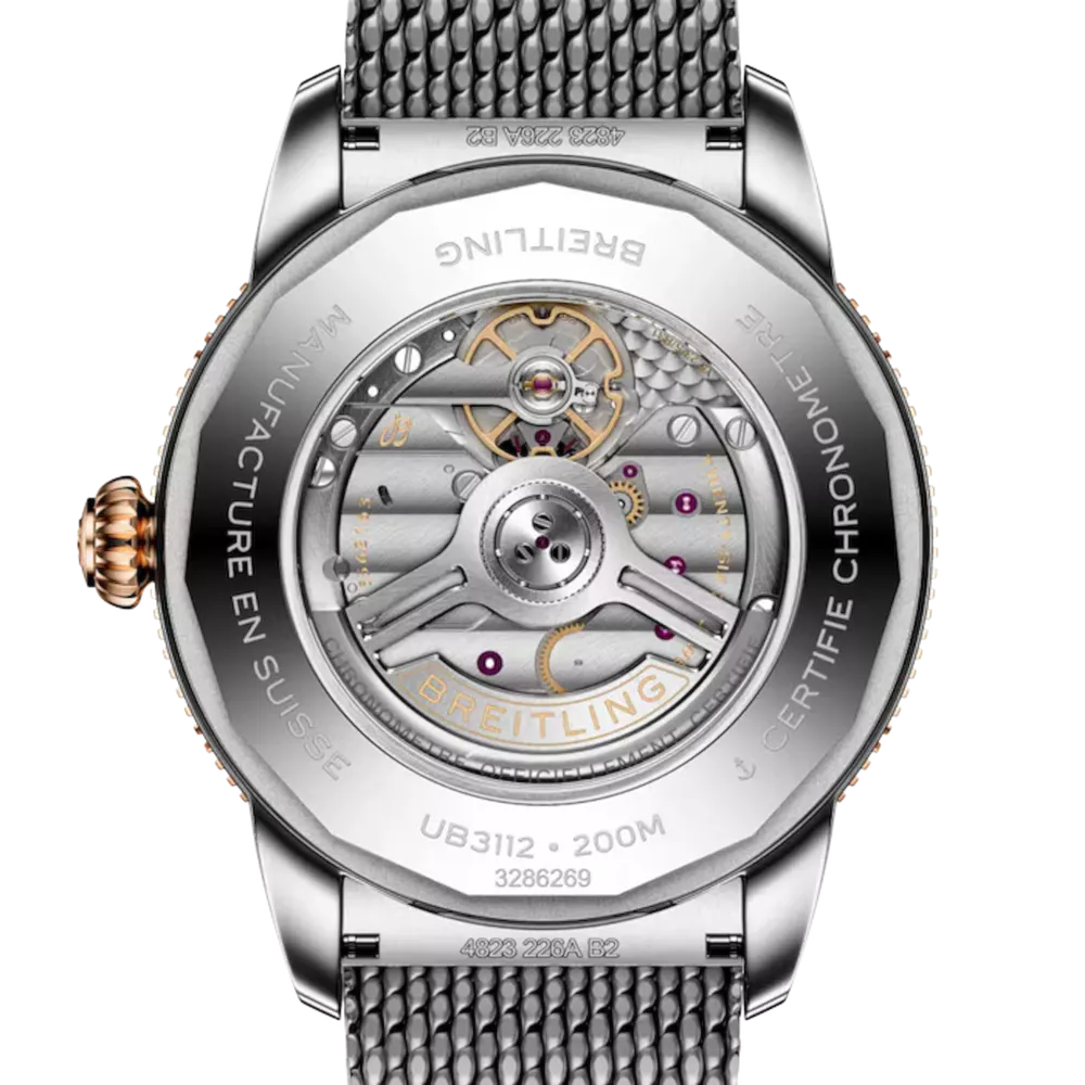 Orologio Breitling Swiss Made con cassa da 44 mm in acciaio inossidabile e oro rosso 18 carati, equipaggiato con il calibro automatico di manifattura B31 con riserva di carica di circa 78 ore e datario a finestrella. Robustissimo e affidabile, offre una resistenza all’acqua di 20 bar, cristallo in vetro zaffiro e corona a vite con doppia guarnizione. Con uno spessore di 12,17 mm e un peso di circa 161 g, è completato da un bracciale in acciaio che ne esalta lo stile sportivo ed elegante.