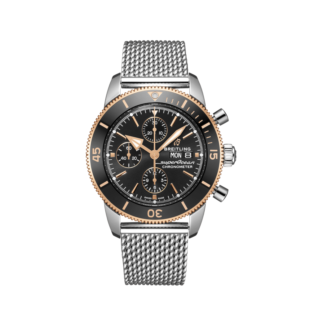 Il nuovo orologio da polso Superocean Héritage II Chronograph 44 è alimentato dal movimento automatico Breitling Caliber 13. Con i sottoquadranti posizionati a ore 6, 9 e 12, questo cronografo ha un aspetto particolarmente sportivo. Esistono due versioni in acciaio inossidabile, una con quadrante nero e una con quadrante blu. Particolarmente accattivante è il modello in acciaio e oro rosso 18 carati con quadrante nero, presentato su un bracciale in acciaio Ocean Classic.