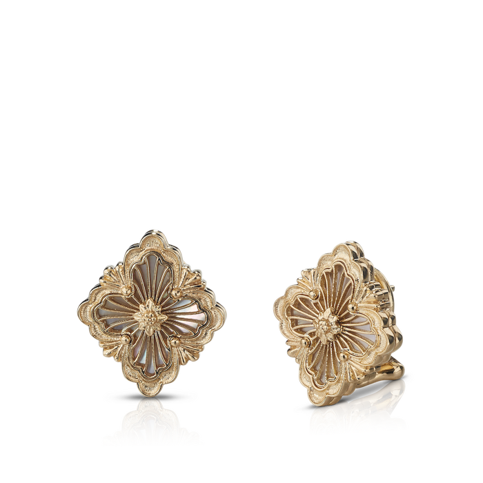 Gli orecchini Opera Tulle di Buccellati rappresentano l'artigianato classico in tutte le sue forme più belle. La borchia a quattro petali di questa coppia è incorniciata da un intricato motivo sulla placca in madreperla, creando un'aggiunta semplice ma immensamente graziosa alle tue modifiche ai gioielli.