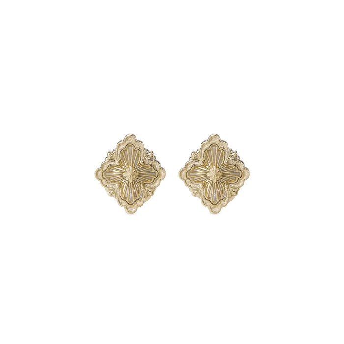 Orecchini a bottone Opera Tulle composti da un elemento logo in oro giallo e da bordi smerlati a forma di ventaglio. L’elemento in madreperla è sormontato da tulle a raggiera con, al centro, una rosetta in oro giallo. Palline lucide in oro giallo.