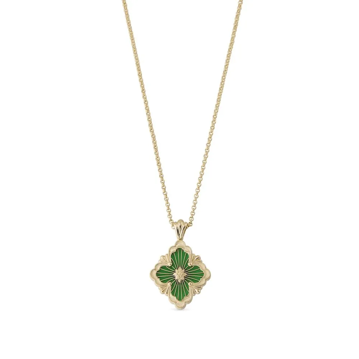 Pendente Opera Tulle composto da elemento logo in oro giallo, sfondo in smalto verde sormontato da tulle a raggiera con, al centro, una rosetta in oro giallo. Bordi smerlati a forma di ventaglio. Catena in oro giallo.