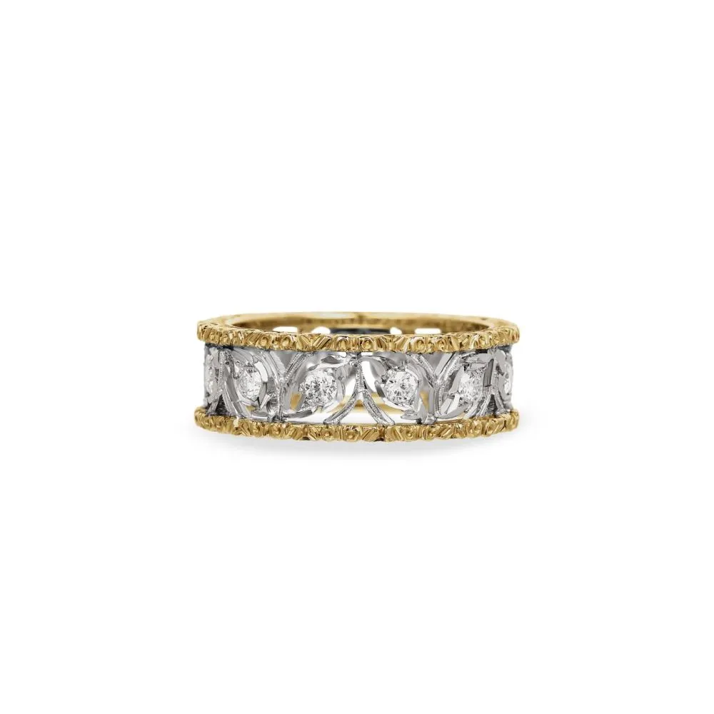 Anello eternelle, con una fila di foglie in oro bianco traforato diamanti, con bordi in oro giallo modellati a foglia