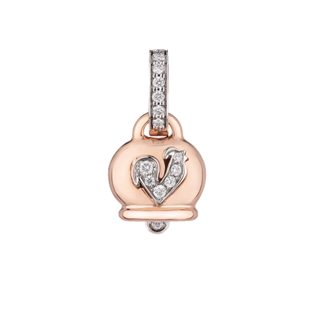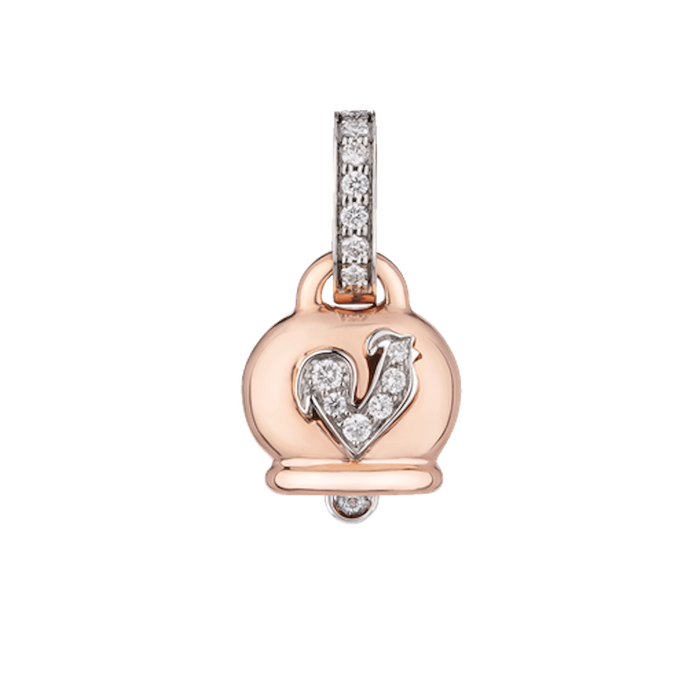 Ciondolo Campanella piccolo in oro rosa 18Kt, diamanti e gallo in pavé di diamanti