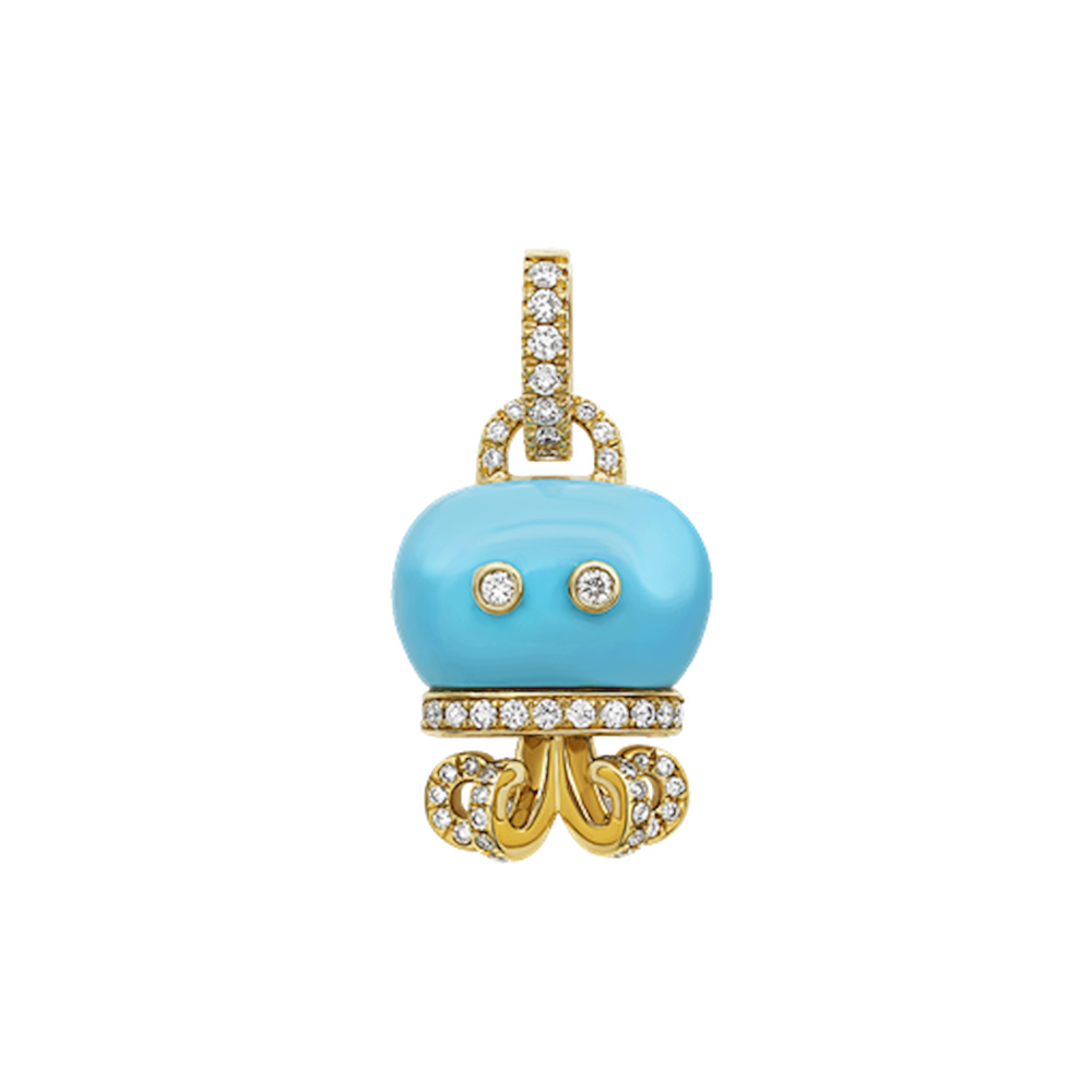 Ciondolo Campanella Polpo medio in oro giallo 18Kt, diamanti e turchese
