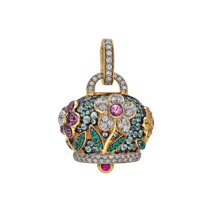Ciondolo Campanella grande Fiori in oro giallo 18Kt, pavé di diamanti, paraiba, smerladi, zaffiri rosa, zaffiri gialli e un rubino nel batacchio