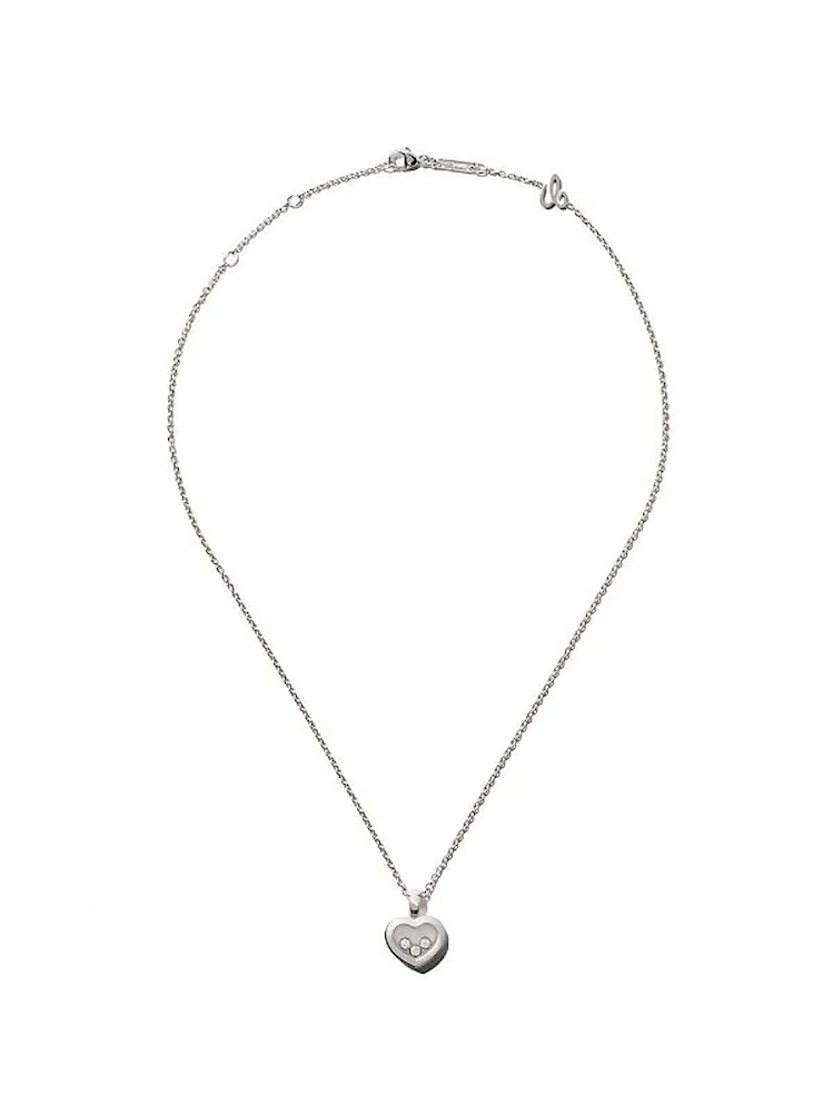 La collezione Happy Diamonds di Chopard, ispirata allo scintillio dell'acqua di una cascata, è caratterizzata da diamanti liberi di muoversi in delicate danze. La collana Happy Diamonds Icons in oro bianco 18kt di Chopard presenta una chiusura a moschettone, una raffinata catena e un pendente a forma di cuore con all'interno tre diamanti liberi racchiusi in due vetri zaffiri, che creano splendidi giochi di luce. Il peso totale del contenuto di diamanti è di 0,15ct. Questo prodotto di Chopard è realizzato al 100% con oro etico, ottenuto da fonti responsabili e verificate sulla base delle migliori pratiche internazionali, in conformità alle norme ambientali e sociali.