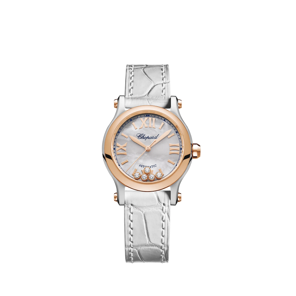Femminile e raffinato, l'orologio Happy Sport in oro rosa 18 carati e acciaio inossidabile è dotato di un nuovo movimento a carica automatica fabbricato internamente dalla manifattura Chopard per celebrare il 25° anniversario di Happy Sport. Catturando perfettamente lo spirito Chopard, la cassa bicolore in acciaio inossidabile racchiude la lucente iridescenza e il tocco delicato del quadrante in madreperla testurizzata rosa millennia.