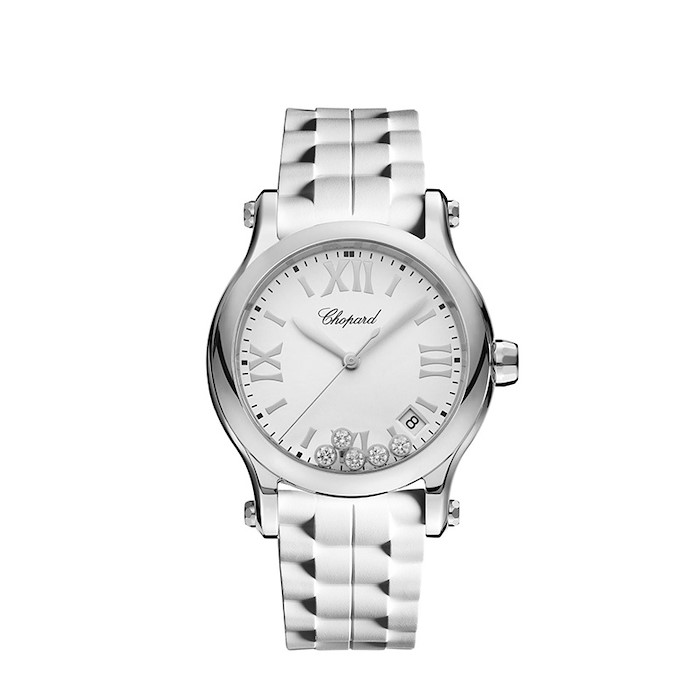 Questo orologio Happy Sport al quarzo da 36 mm in acciaio inossidabile incarna una scintillante femminilità. All'audace concezione della lunetta lucida e alle eleganti anse che ne proseguono le sinuose curve si abbinano i giocosi diamanti mobili e i due cinturini intercambiabili. In questa versione, un cinturino in caucciù bianco conferisce un tocco contemporaneo in perfetta sintonia con la visione della donna moderna secondo Chopard e della sua irrefrenabile gioia di vivere.