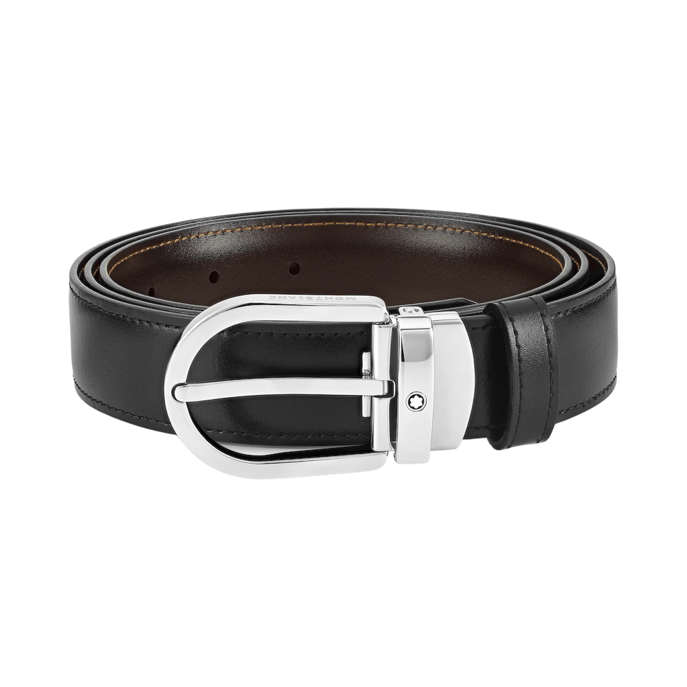 Fibbia ad ardiglione a ferro di cavallo finitura palladio lucido con marchio Montblanc inciso sui lati ed emblema Montblanc. Cinghia auto-regolabile, 3 cm x 120 cm, reversibile in pelle nera/marrone. Raffinata e discreta, adatta a qualsiasi look.