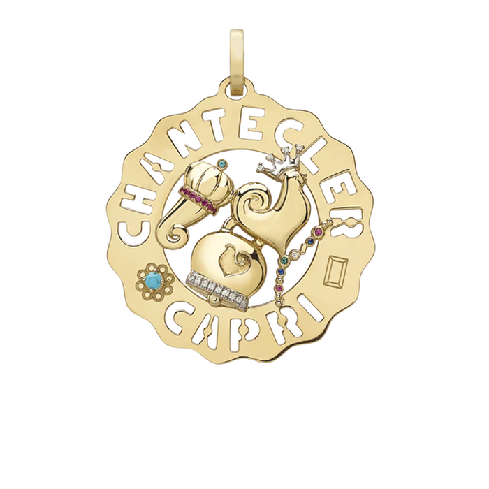Ciondolo Logo Gallo, Campanella, Cornetto grande in oro giallo 18 Kt, diamanti, rubini, zaffiri, smeraldi e turchese, Collezione: Logo