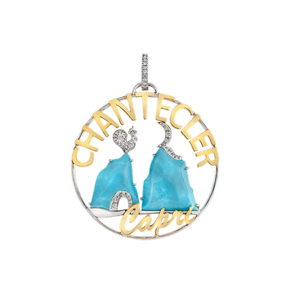 Ciondolo Logo piccolo in oro giallo e bianco 18kt, diamanti e turchesi compositi