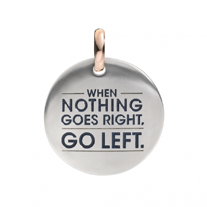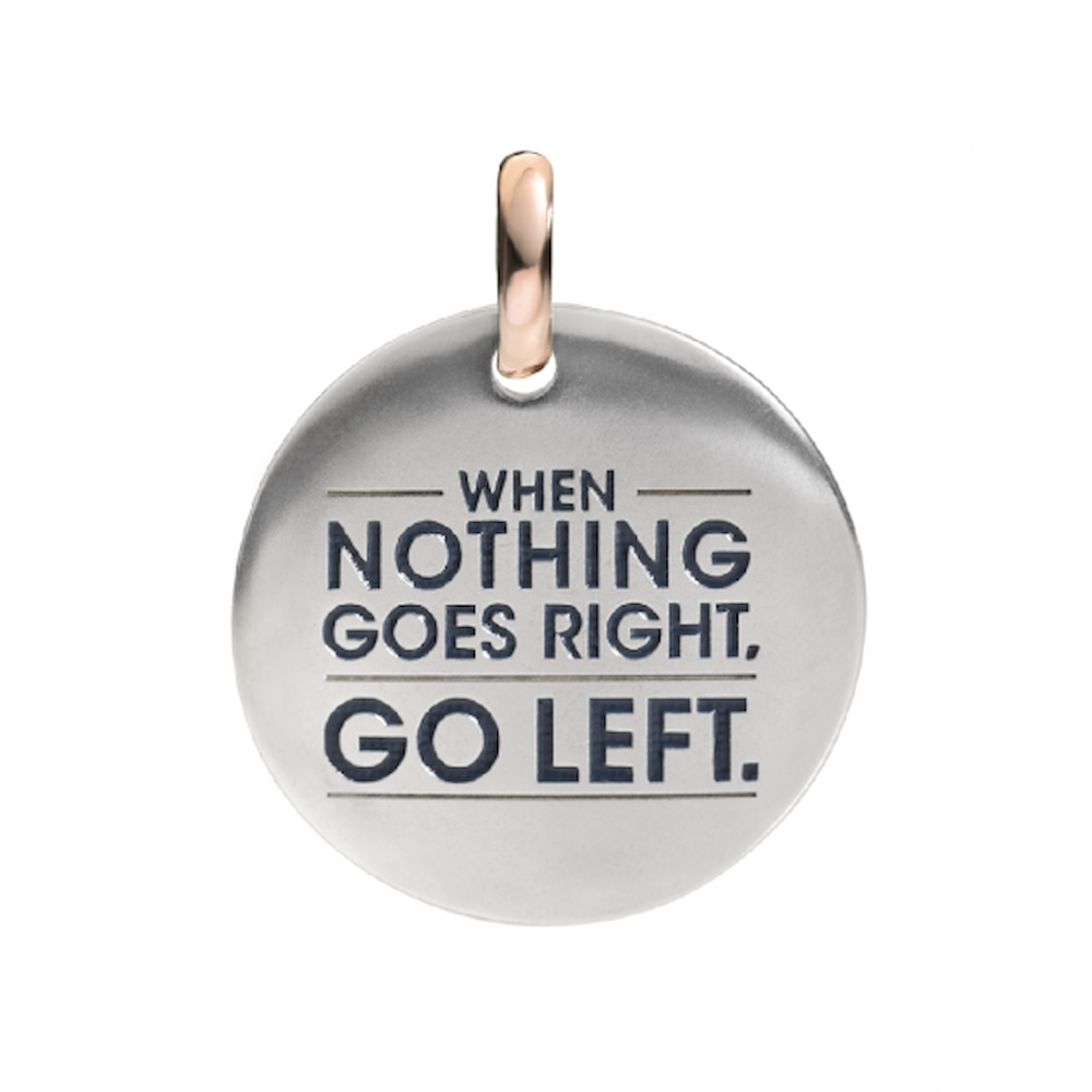 Moneta Queriot "When Nothing goes Right: Go Left" in Argento 925, asola in oro rosa 9k e scritta incisa con smalto a freddo