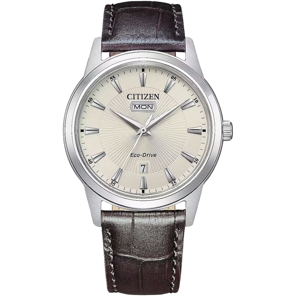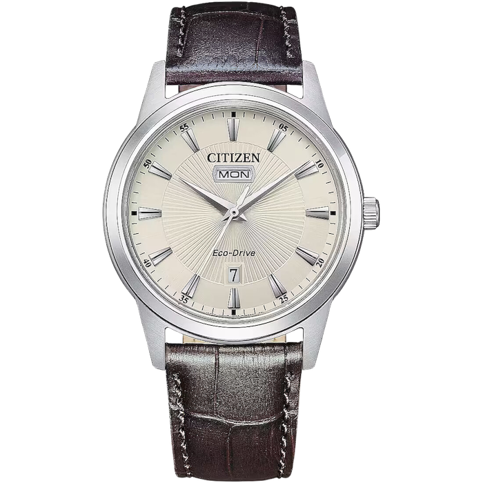 Orologio Solo Tempo Da Uomo Della Collezione Of Classic Di Citizen. Orologio Solo Tempo Con Cassa In Acciaio. Diametro Cassa 40 Mm. Il Quadrante È Chiaro Con Indici Applicati E Calendario Completo E Cinturino In Morbida Pelle Marrone. La Resistenza All'Acqua È 5 Atm. Il Movimento È Eco Drive Con Riserva Di Carica Di 8 Mesi. Funzioni: Solo Tempo Eco Drive E Datario. Il Vetro È Minerale. La Referenza È Aw0100-19A.