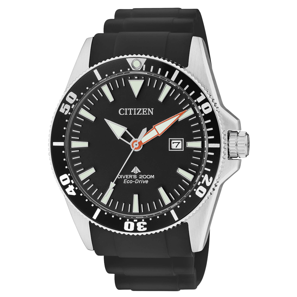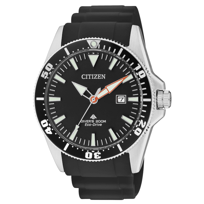 Cassa in acciaio, cinturino in morbido poliuretano. Vetro minerale. Ghiera girevole unidirezionale. Indici e sfere ad alta luminosità. Fondo e corona serrati a vite. WR 20 bar.