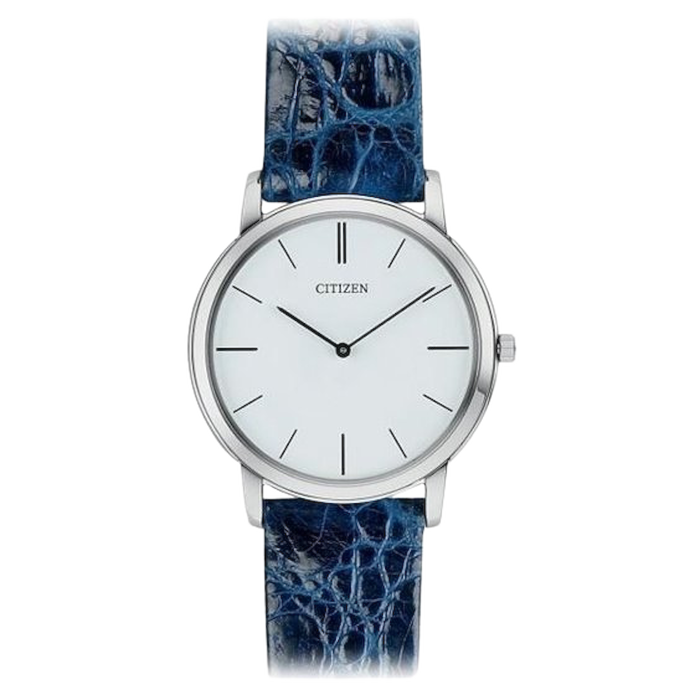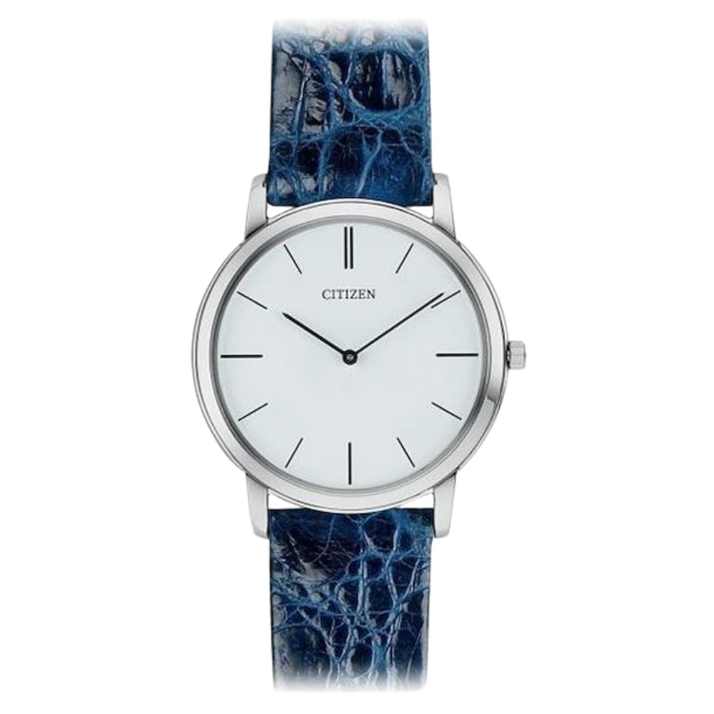 Citizen con movimento Eco-Drive a carica di luce infinita , ultrapiatto con soli 4,5 mm di spessore , cassa in acciaio mm 38 , vetro zaffiro minerale inscalfibile , cinturino in coccodrillo realizzato artigianalmente , Water Resistant 4 bar.