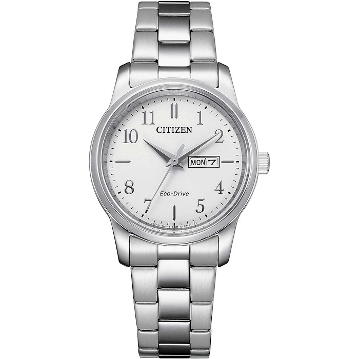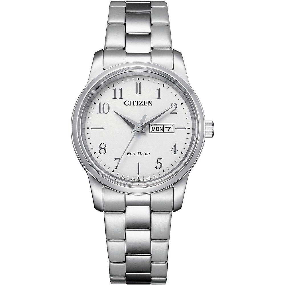 Orologio Solo Tempo Da Donna Di Citizen Della Collezione Classic. Orologio Con Cassa E Braccaile In Acciaio E Cassa Con Diametro Di 30 Mm. Bracciale In Accaio. Orologio Con Quadrante Bianco Con Numeri Arabi. La Resistenza All'Acqua È Di 5 Atm. Il Movimento È Eco Drive Con Riserva Di Carica Di 6 Mesi E Con Funzione Solo Tempo Day Date Con Datario. Orologio Con Vetro Minerale
