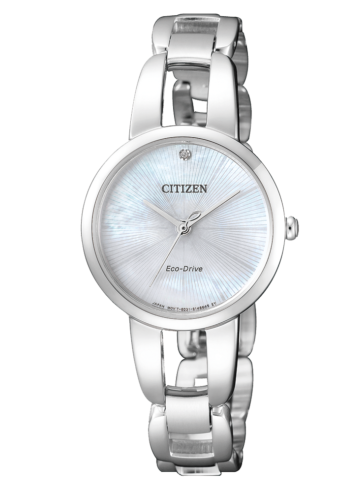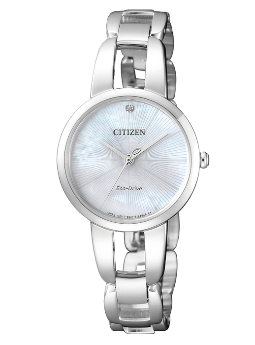 Eco-Drive (a carica luce ) con riserva di carica di 6 mesi. Cassa e bracciale in acciaio. Quadrante in madreperla con diamante applicato a ore 12. Vetro zaffiro. WR 5 bar