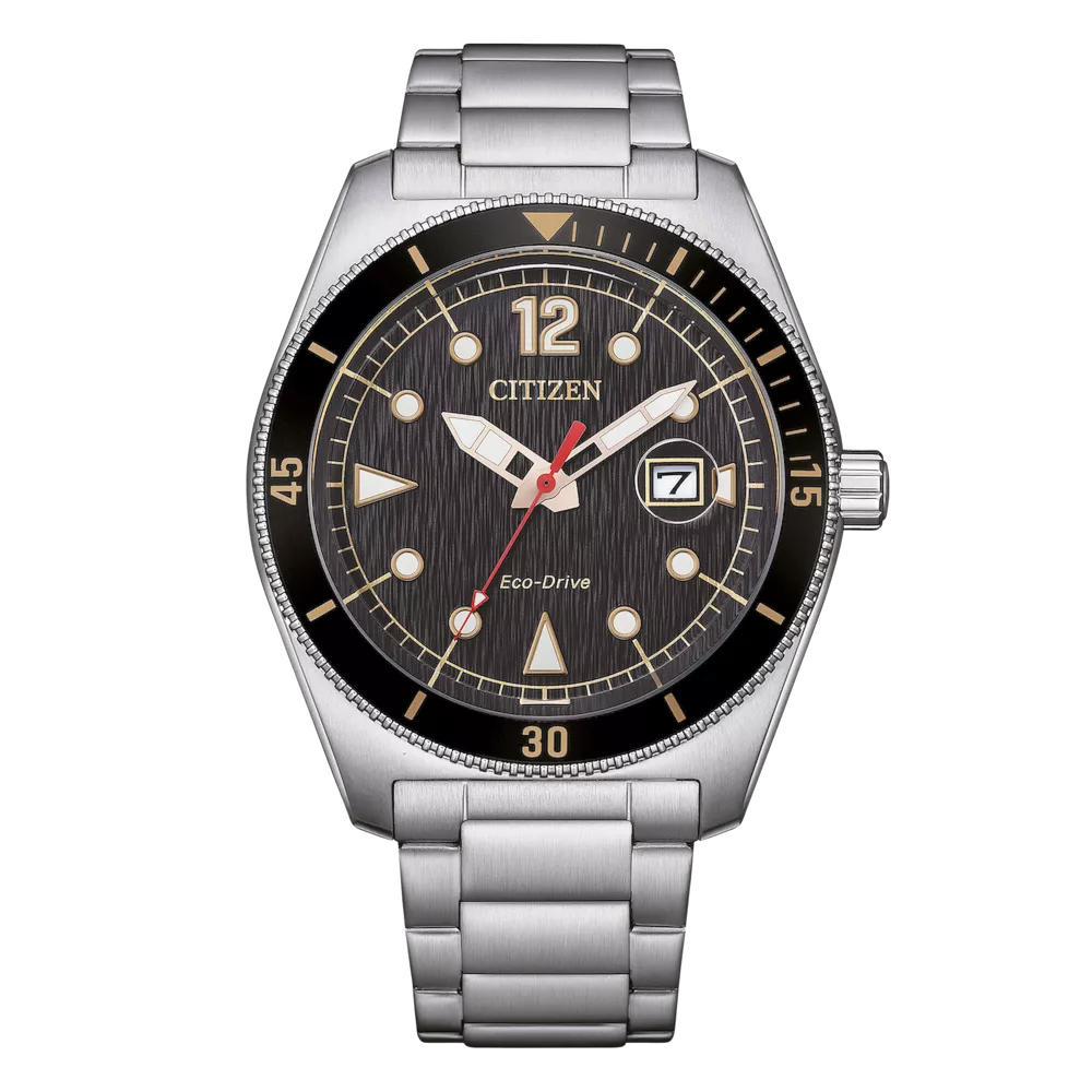 Il modello Citizen AW1888-53E è un orologio da uomo con movimento Eco-Drive a carica luce e riserva di carica fino a 240 giorni, cassa in acciaio da 43 mm con fondo serrato a vite, lunetta con inserto in alluminio e finitura acciaio, bracciale in acciaio con chiusura di sicurezza, vetro minerale, quadrante analogico nero e impermeabilità fino a 10 bar; peso circa 153 grammi.